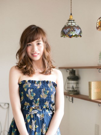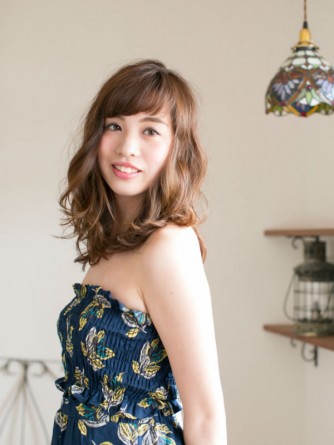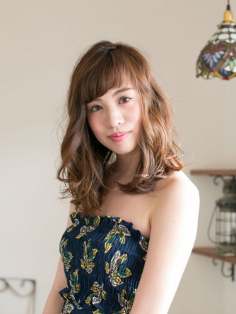 落ち着きのあるミディアムレングスに、ランダムに動いたカールで柔らかさと華やかさをプラスしました。前髪をカールすることでかわいさをアップさせたり、印象を変えることができます。