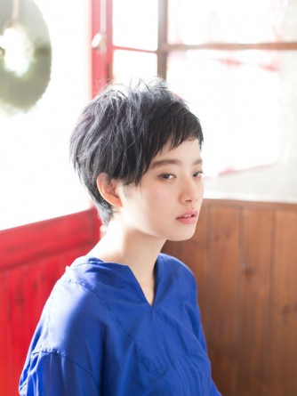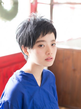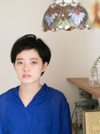 シンプルな黒髪ショートスタイルです。襟足を締めて綺麗なバランスと奥行きのあるヘアスタイルになります。少しのニュアンスと透け感で、黒髪でも重くならないようになります。